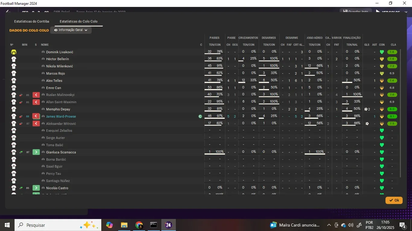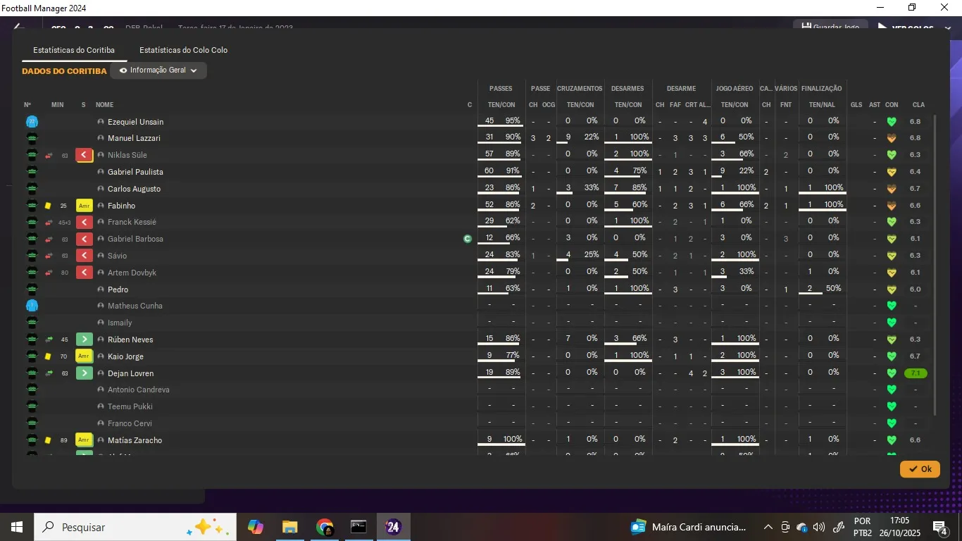 | Name | Jogos | Mins | Gols | Ass | Sofr | C.A. | C.V. | MeC | Class |