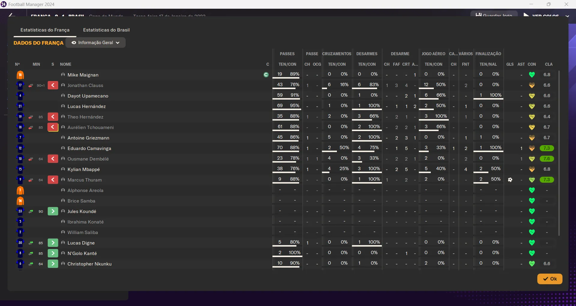 | Name | Jogos | Mins | Gols | Ass | Sofr | C.A. | C.V. | MeC | Class |
