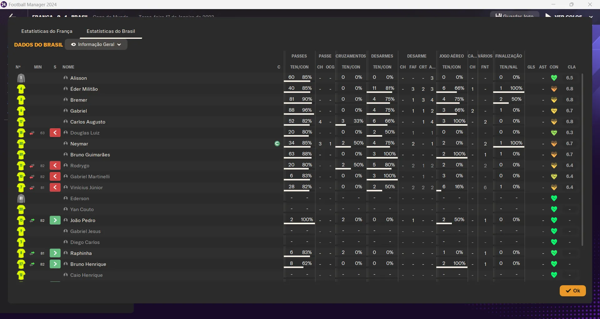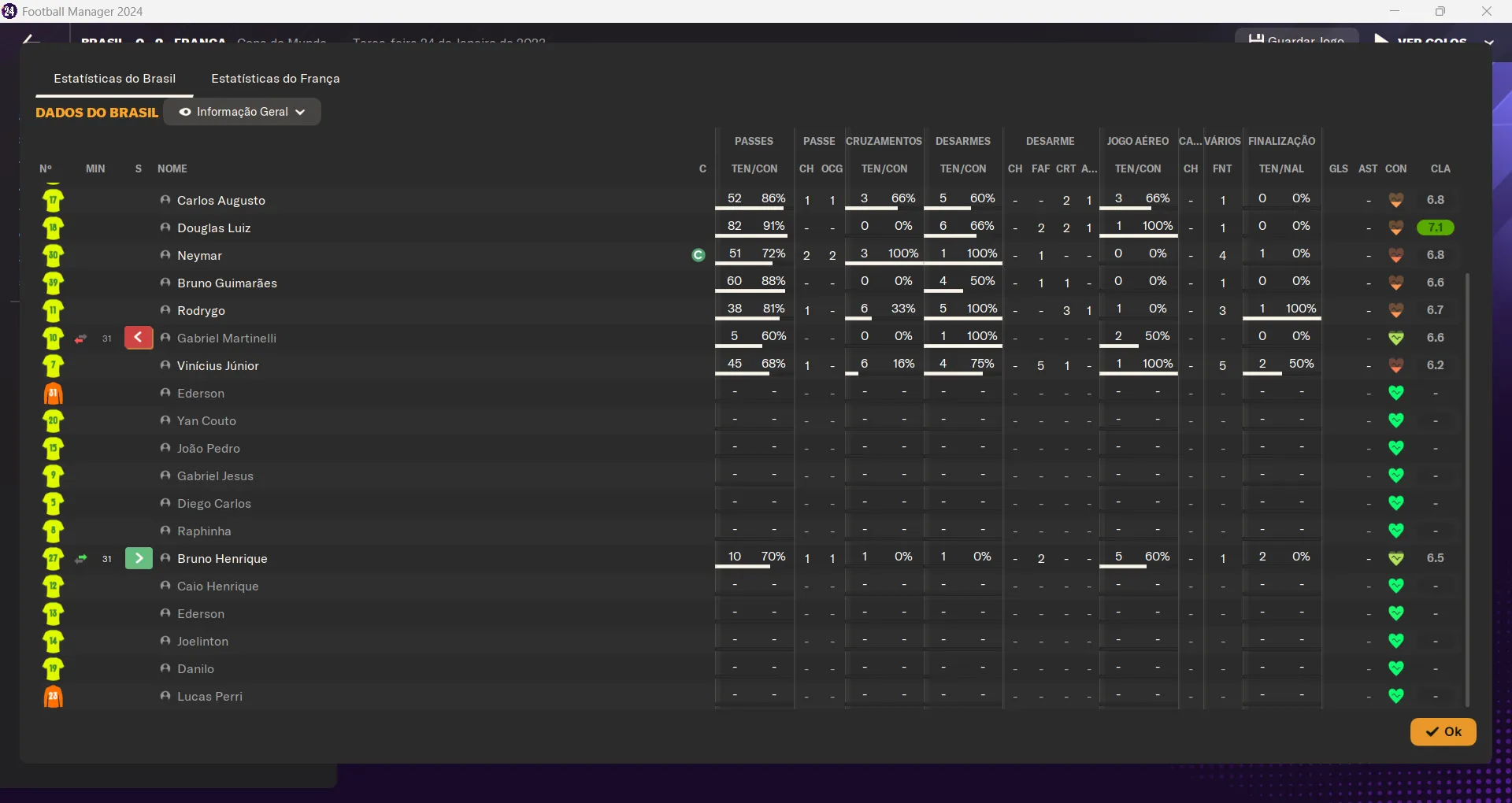 | Name | Jogos | Mins | Gols | Ass | Sofr | C.A. | C.V. | MeC | Class |
